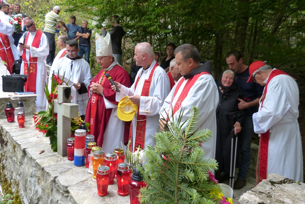 4. I zato braćo i sestre kad razmišljamo o teškim mukama koje su prolazila naša braća i sestre na ovom stratištu ispunjeni smo nadom i vjerom. Kao što Bog Otac nije napustio svoga Sina u njegovim teškim časovima, nego ga je krijepio i davao snagu da izdrži do kraja, koji ga je od mrtvih uskrisio i postavio sebi zdesna, tako je Bog bio i s ovom našom braćom i sestrama u svim njihovim patnjama pa i u samoj smrti. Iako nam je teško i zamisliti muku, kroz koju su prošle žrtve ovog strašnog pokolja u trenucima prije smaknuća, Bog ih nipošto nije napustio, nego ih je tješio i krijepio da mogu izdržati do kraja. Bio je s njima kad su prolazili kroz dolinu smrti. O sličnoj situaciji imamo živo svjedočanstvo iz domovinskog rata. Vilim Karlović, čudom preživjeli vukovarski branitelj odveden na stratište Ovčare, posvjedočio je da ni od koga od naših ljudi na Ovčari nije čuo ružnu riječ, psovku ili proklinjanje prije okrutne smrti, nego samo vapaje Bogu i molitve. Uistinu, kako je rekao, naši su ljudi umirali dostojanstveno s molitvom na usnama. Tako umiru istinski vjernici, katolici. Na taj su način umirala zasigurno i ova naša braća i sestre, ovdje mučeni. To je zapravo duša našega naroda, da u teškim trenucima vapimo Bogu, da ga ne zaboravljamo, da se u Njega ufamo, da njegovu nebesku Majku zazivamo. Pa i sami smo bili svjedoci kako se naš narod na početku rata okupljao na gradskim trgovima i molio krunicu. Naši su branitelji s krunicom oko vrata išli u obranu svojih ognjišta. Mnogo je također onih koji su svjedočili o dubini vapaja i molitve koju su upućivali Bogu i njegovoj svetoj Majci u teškim trenucima u kojima su se u ratu nagli. Bez Božje pomoći i zagovora majke Božje slobodu sigurno ne bismo izvojevali. Zato trebamo Bogu i Gospi biti zahvalni i to nikada ne zaboraviti. O tome ovisi i naša sadašnjost i naša budućnost.