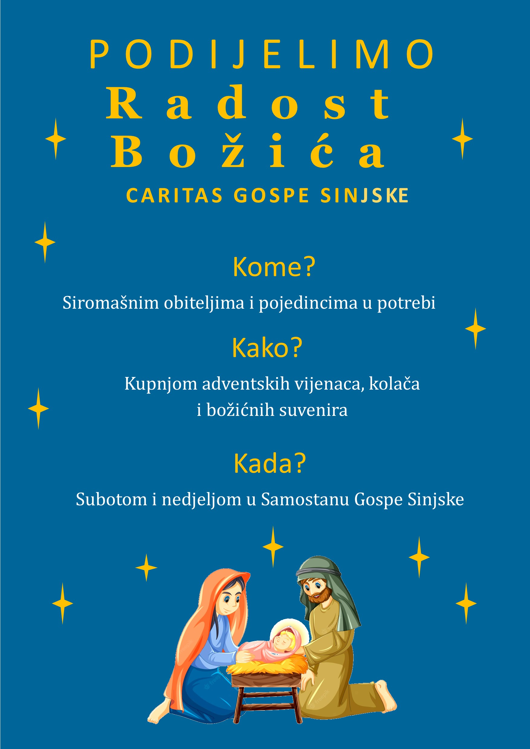 Uspješno je provedena akcija "Radost Božića", koju su organizirali i pokrenuli Župa i Samostan Gospe Sinjske. U vremenu od 27. studenoga - 18. prosinca 2022. godine organizirana je prodaja adventskih vijenaca i kolača te su se prikupljale osnovne namirnice, koje su podijeljene u obliku božićnih paketa korisnicima Caritasa 19. i 20. prosinca 2022. Uoči došašća organizirana je prodaja adventskih vijenaca, a u došašću svake nedjelje župne zajednice su organizirale prodaju kolača. Od prodaje adventskih vijenaca i kolača ostvaren je prihod od 24. 200, 00 hrk. Više od 100 božićnih paketa podijeljeno je ljudima u potrebi. U akciji su sudjelovali mnogobrojni župljani, a sama realizacija bila je povjerena članovima župnih zajednica. Od srca zahvaljujemo za angažman našim župnim zajednicama: Franjevačkoj mladeži, Trećem franjevačkom redu, Obiteljskoj zajednici, liturgijskim čitačima, zajednici "Dobri Pastir", Udruzi "Cjelovit život".