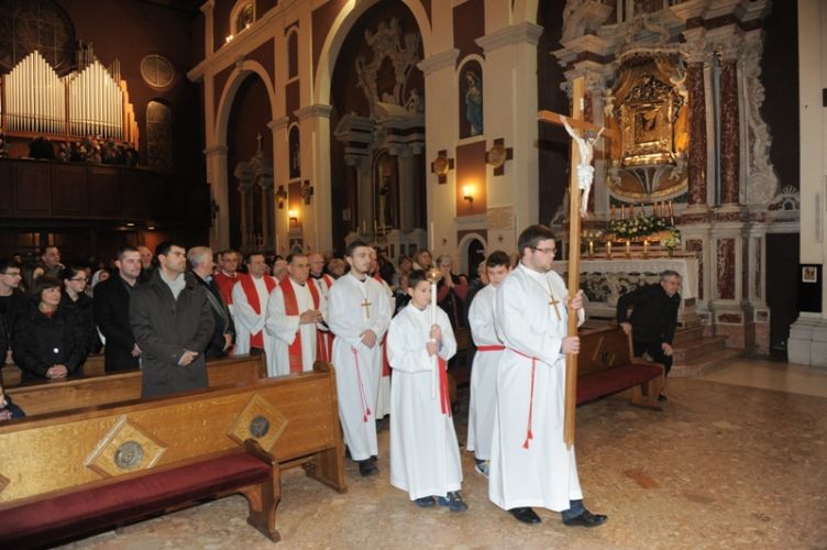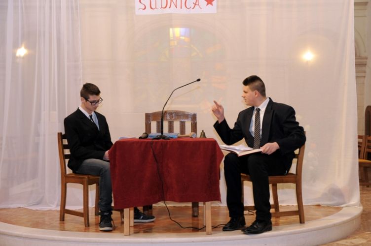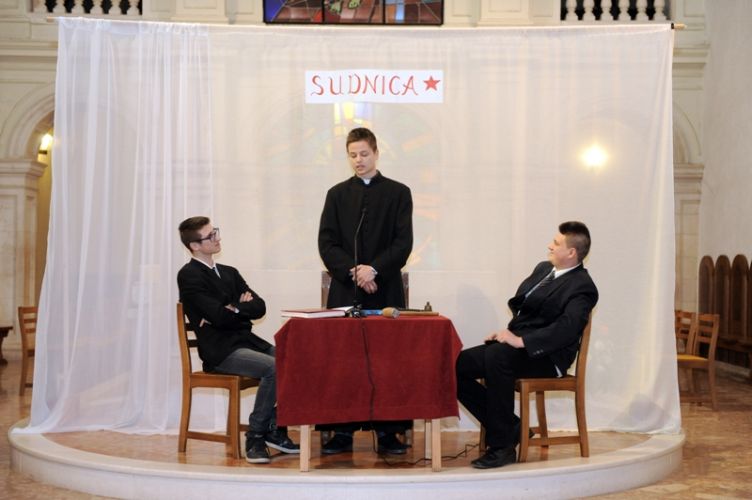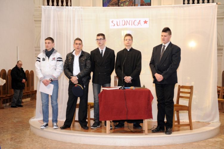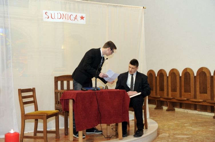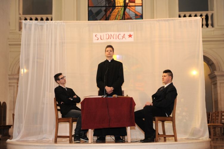 „Čovjek nade često i ne osjeća neku naročitu nutarnju snagu, niti se osjeća herojski. Naprotiv, osjeća da nije dorastao svemu onomu što ljudi i Bog stavljaju preda nj. Ni uz cijenu najvećih žrtava ne odustaje od životnoga puta što ga je pred Bogom preuzeo. Takav čovjek ne očekuje čuda, pa ipak ono što radi, uz Božju pomoć biva uistinu čudo. Takav čovjek nade bio je Alojzije Stepinac,“ zaključio je župnik fra Ante. Poslije svete mise članovi Franjevačke mladeži izveli su scenski prikaz: „Saslušavanje i suđenje Alojzija Stepinca.“ Svojom izvedbom framaši su prikazali dijalog između tužitelja Jakova Blaževića, njegovog pomoćnika i hrabro svjedočenje optuženog Alojzija Stepinca. Na kraju predstave, framaš Tomislav Radić pročitao je dio iz Oporuke koju je blaženi Alojzije Stepinac napisao vjernicima svoje dijeceze u Krašiću 28. svibnja 1957. godine. U predstavi su sudjelovali framaši Moreno Vuković (Alojzije Stepinac), Jakov Blažević (Stipe Buljan), Tomislav Kovačević (pomoćnik tužitelja) i Stipe Dinarina (milicajac).