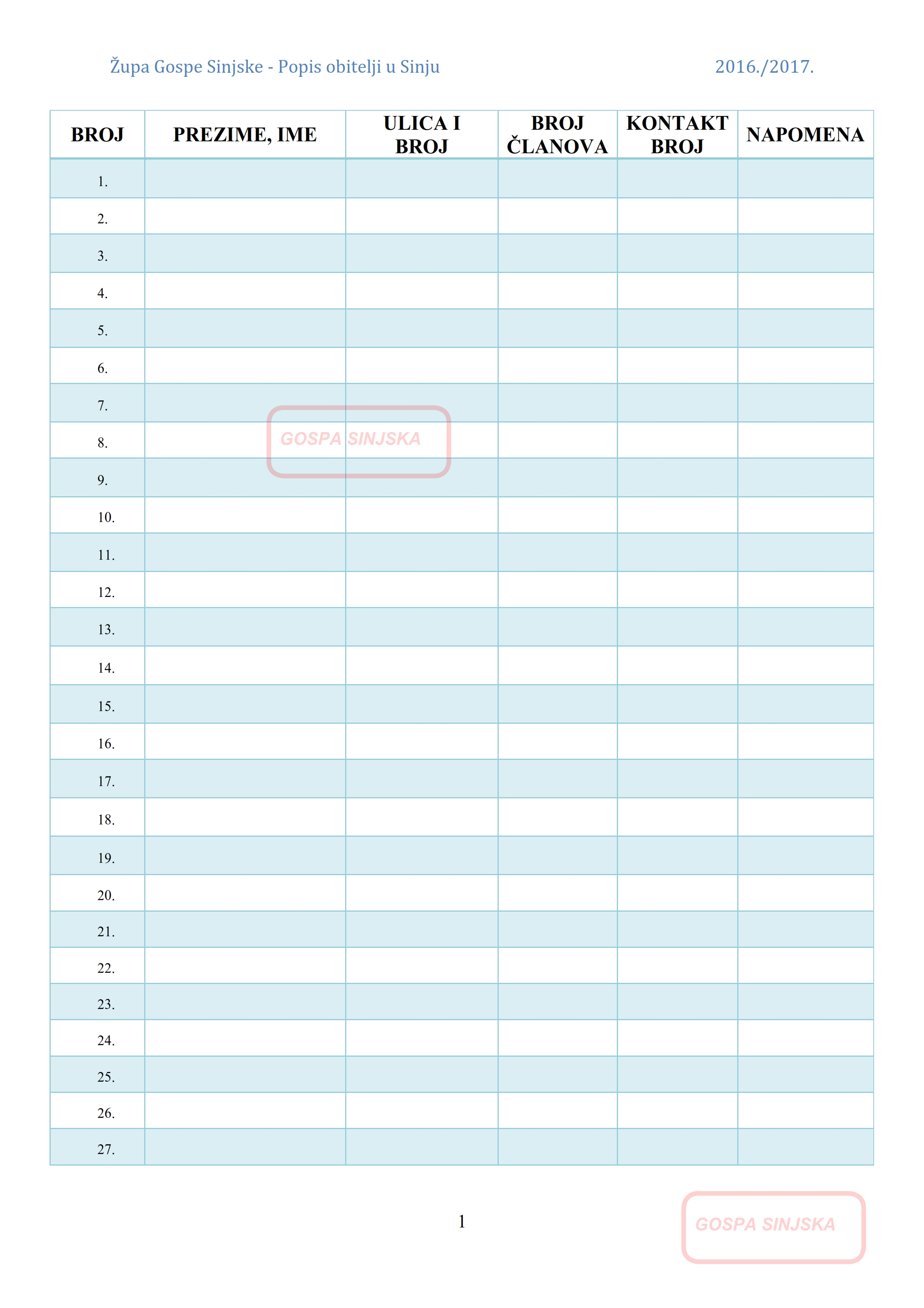 Naš popis obitelji obuhvaća podatke iz sljedećih naselja:1) Sinj; 2) Čitluk-Jasensko; 3) Karakašica; 4) Lučane; 5) Radošić; 6) Brnaze; 7) Glavice. Srdačno zahvaljujemo za vašu suradnju kod popisivanja. Tako nam omogućujete još kvalitetniji pastoralni rad. Svi prikupljeni podaci potpadaju pod kategoriju "Uredska tajna".
