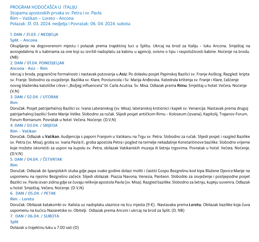 Od 31. ožujka – 6. travnja 2024. u organizaciji Svetišta i Župe Gospe Sinjske, održat će se hodočašće u Italiju: Rim, Asiz, Loreto. Donosimo program hodočašća.