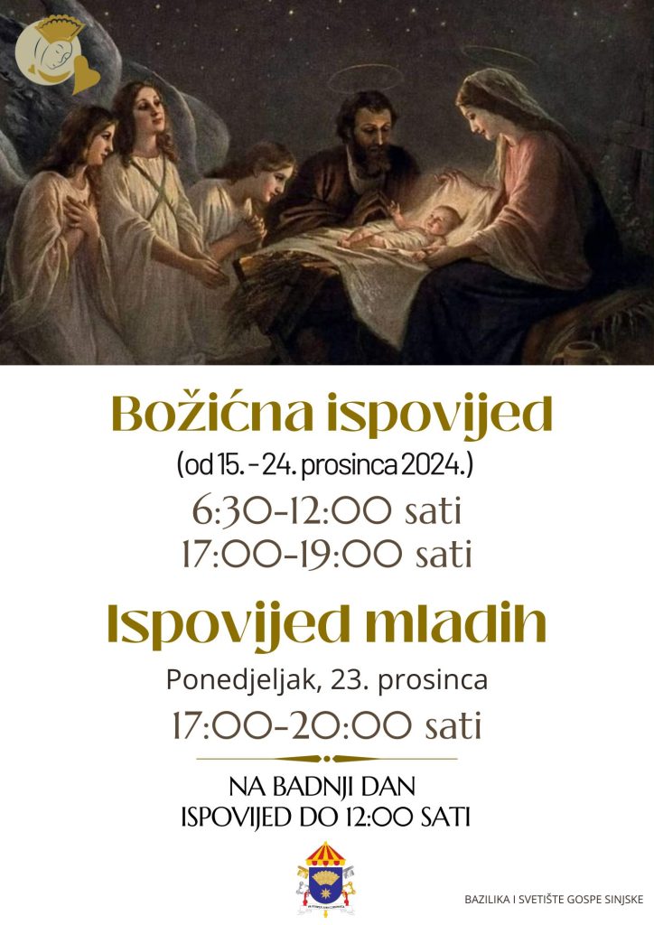 Vjernici će imati mogućnost za sakrament ispovijedi svakoga do podne od 6:30-12 sati i poslijepodne od 17-19 sati. Ispovijed za mlade iz Sinja i Cetinskog dekanata bit će u ponedjeljak 23. prosinca od 17-20 sati. Na Badnji dan u utorak 24. prosinca, ispovijed u Svetištu će biti od 6:30-12:00 sati.